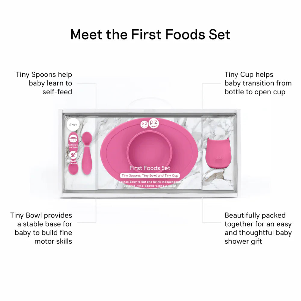 Most parents introduce first foods to their baby at 4-to-6 months of age. This experience can be fun, but it also can be messy, stressful and overwhelming. With the First Foods Set ezpz provides all of the developmental tools you need to set baby up for mealtime milestones – plus calm & confident parents! It helps with eating and drinking independence. For on-the-go use, one can use it with the Tiny Bowl Lid (sold separately). The base of the Tiny Bowl suctions to most surfaces, thus reducing spills and avoiding messes.