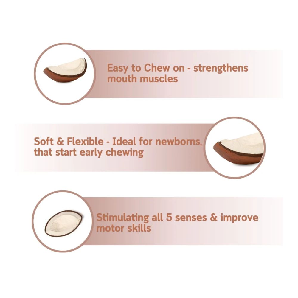 Coco the Coconut is freshly picked from exotic palm trees! It is a fruit-shaped baby teether that will stimulate babies’ senses while soothing little gums. Introduce kids into a healthy lifestyle from an early age! It will become babies and kids’ favorite teether, bath toy and sensory play toy. This product is perfect as a baby teether, babies and kids toy, bath toy, for sensory play and decorative object. It is made following an artisanal, sustainable and eco-friendly process with 100% natural rubber from Hevea trees. As it is made all in one piece with no holes, it avoids the creation of bacteria inside. Hand painted with natural pigments one by one, so there are no two alike!