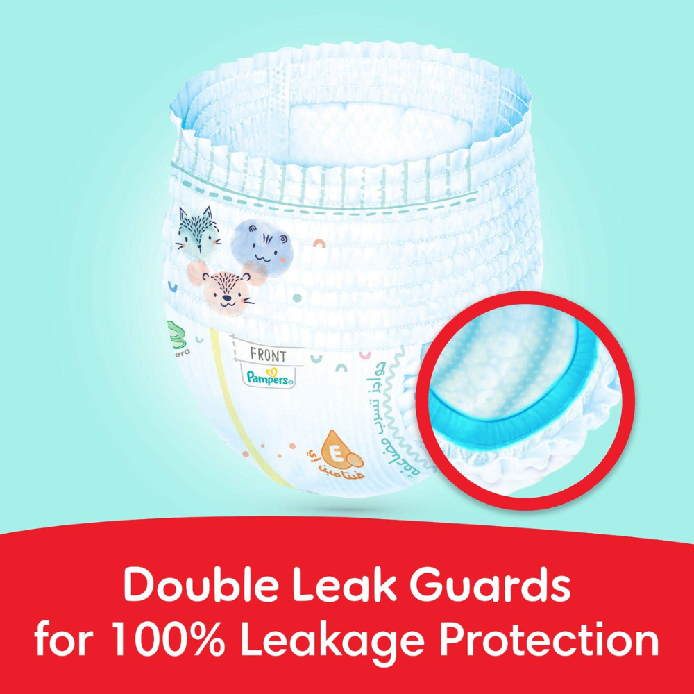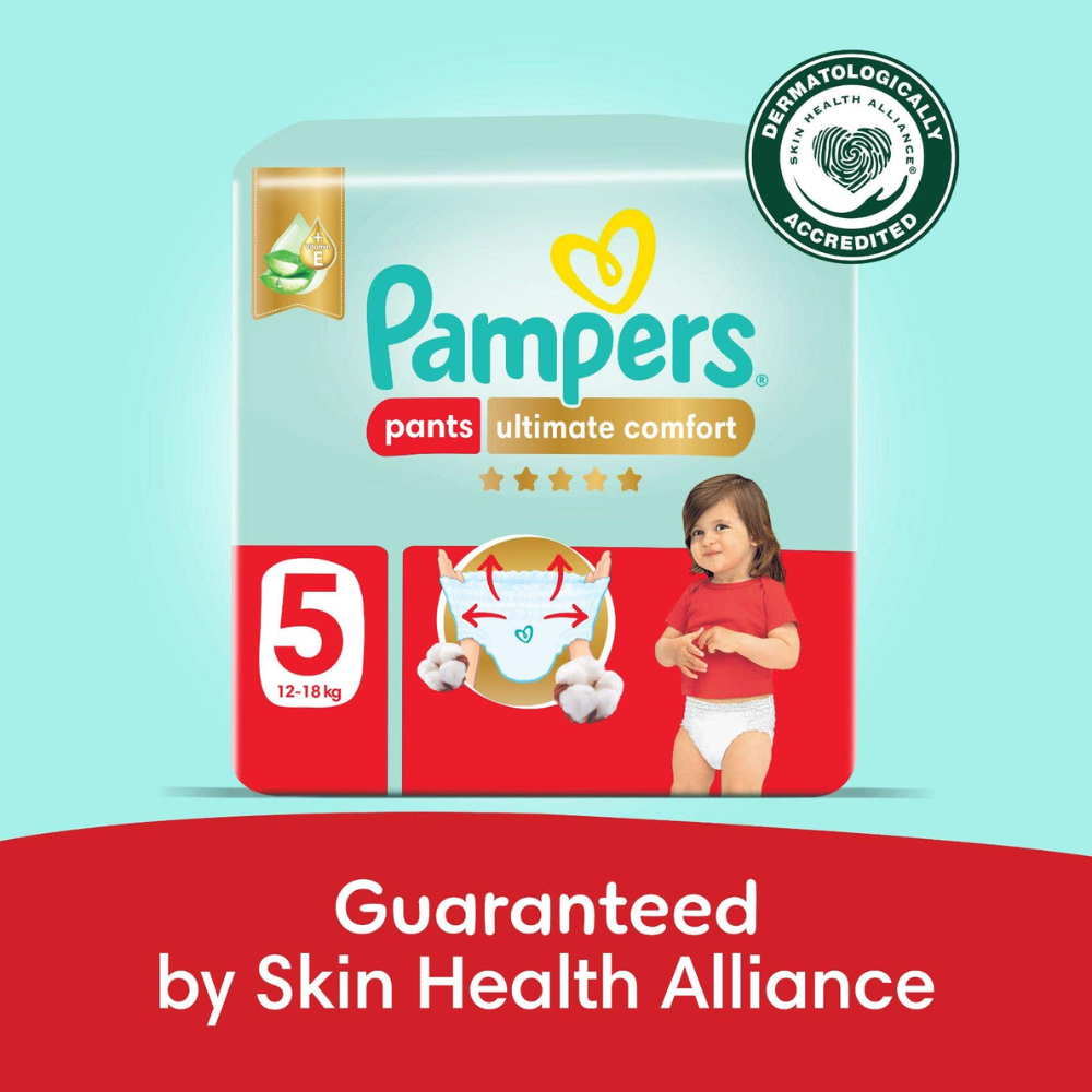 Pampers Ultimate Comfort baby diaper pants is the new and upgraded version of the Pampers Premium care which is crafted to provide superior leakage protection. It offers a cottony soft fit and stretchy belt for ultimate comfort and up to 100% leakage protection. Luxuriously infused with Aloe Vera and Vitamin E, these baby pant diapers create a moisture barrier, keeping your baby’s skin fresh, smooth, and healthy. These new and improved baby diaper pants are designed with double leak guards and can stretch from all sides to adapt to baby’s movements, providing an additional protection against leakage. Pampers diapers are recognized globally for skin health and safety compliance. Accredited by the Skin Health Alliance (SHA), Pampers are proven to be safe when in contact with your baby’s delicate skin.