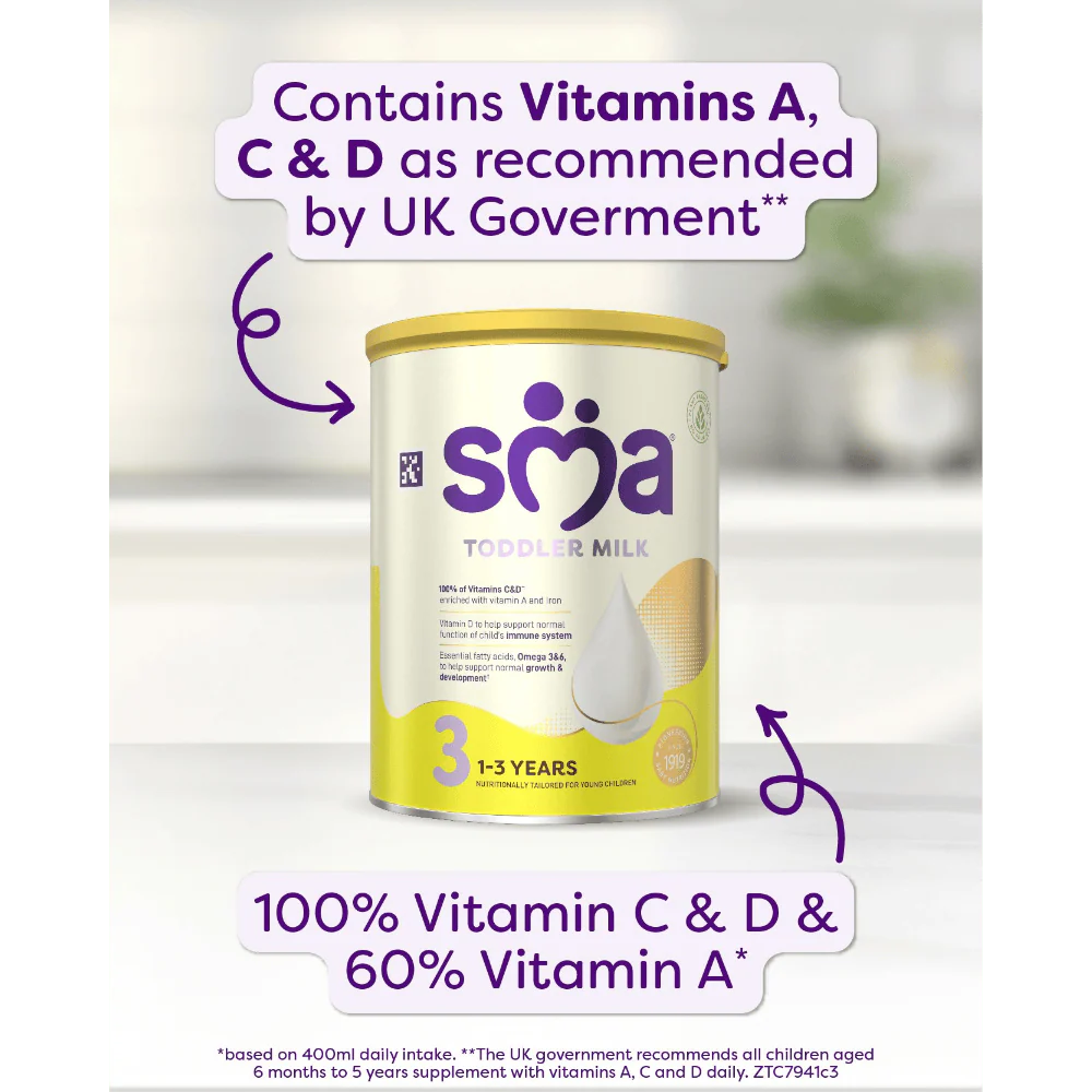 *400ml daily intake of SMA® Toddler milk delivers 100% of toddlers daily recommended amount of vitamins C & D