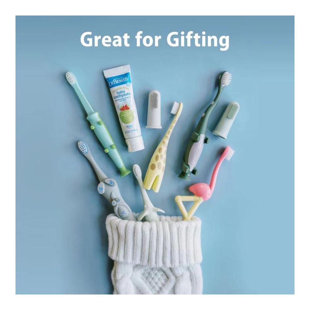 THREE SIDED TODDLER TOOTHBRUSH: Dr. Brown’s ToothScrubber Toothbrush has a uniquely designed brush head with soft bristles that wrap around the tooth to clean 3 sides at once.