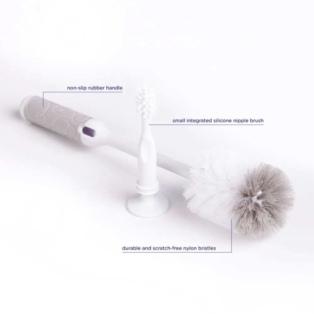 The Ubbi Bottle Brush was designed with a comfortable and functional non-slip rubber handle for easy grip. The soft nylon bristles were made to be durable and scratch-free to safely clean any standard plastic or glass bottles. For added functionality, the integrated small nipple brush found in the handle allows for a more thorough and efficient cleaning. With a modern bubble pattern design and neutral color, it is sure to fit any kitchen décor.